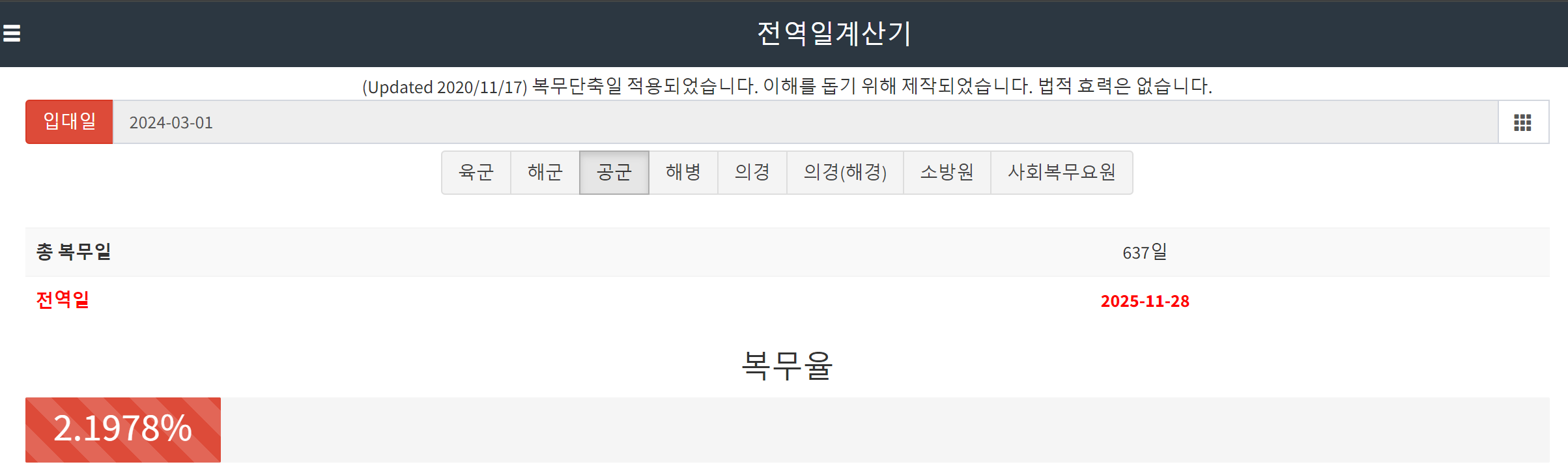 참고로 복무형태별 군복무기간은 육군 18개월, 해군 20개월, 공군 21개월입니다. 복무형태별로 복무기간이 다르니 군복무기간 계산기를 이용하셔서 정확한 전역일을 계산해보시기 바랍니다.