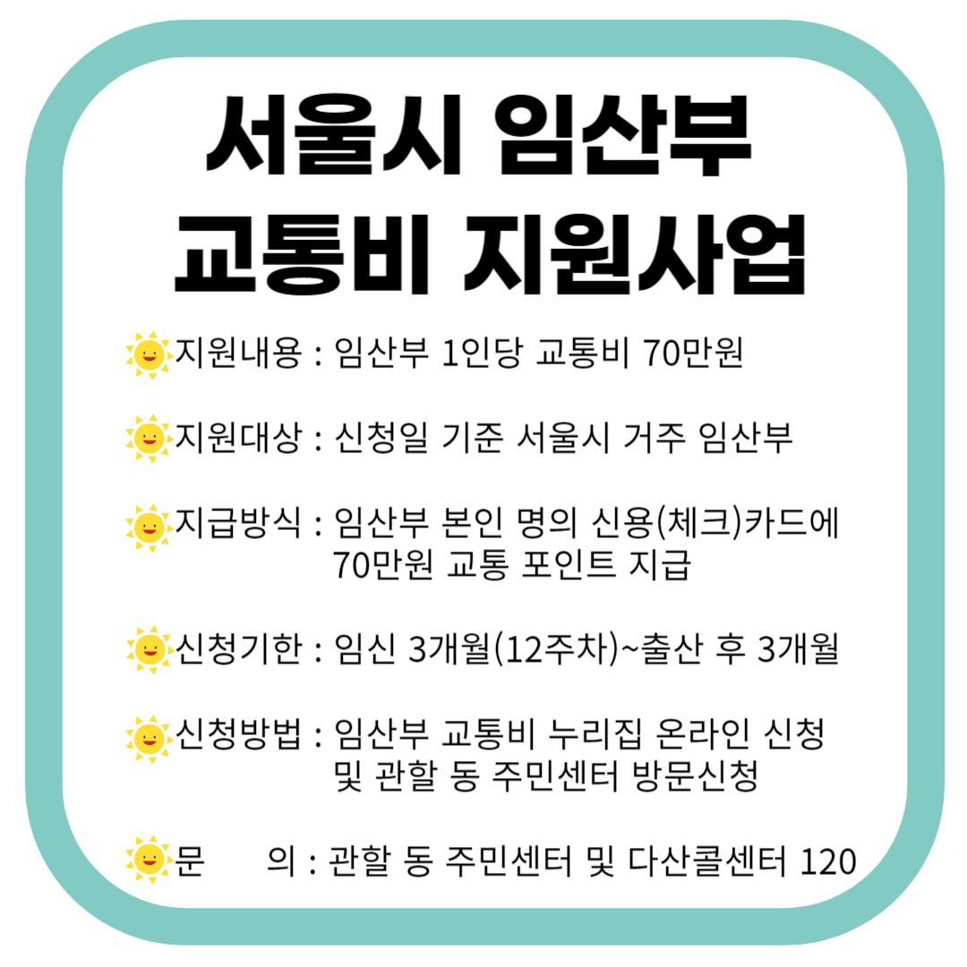 최근 출산율을 높이기 위한 정책이 많이 시행되고 있는데요, 서울에 거주하는 임산부라면 누구나 70만원을 지원받을 수 있는 교통비 지원사업을 알아보려고 합니다. 서울에 거주하는 임산부라면 이번 포스팅에서 지원대상과 신청방법을 알아보고 꼭 혜택받으시길 바랍니다.