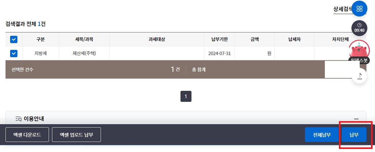 3) 납부대상을 확인하고 우측 하단에 있는 "납부" 버튼 클릭하기