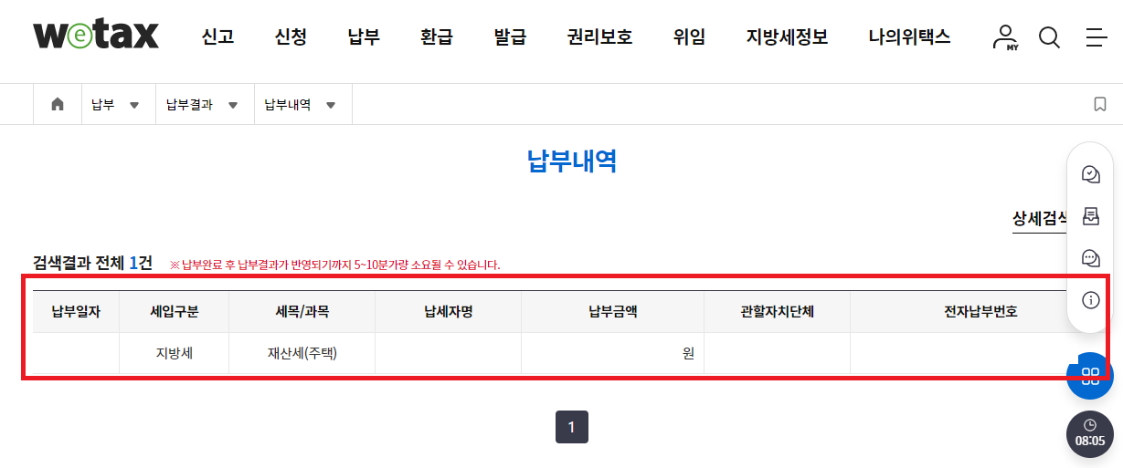 5) 납부 → 납부결과 → 납부내역에서 납부한 내역확인하기