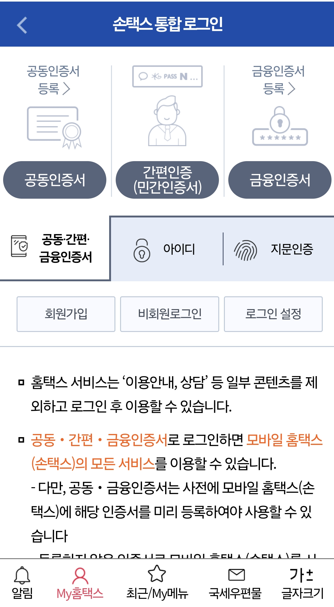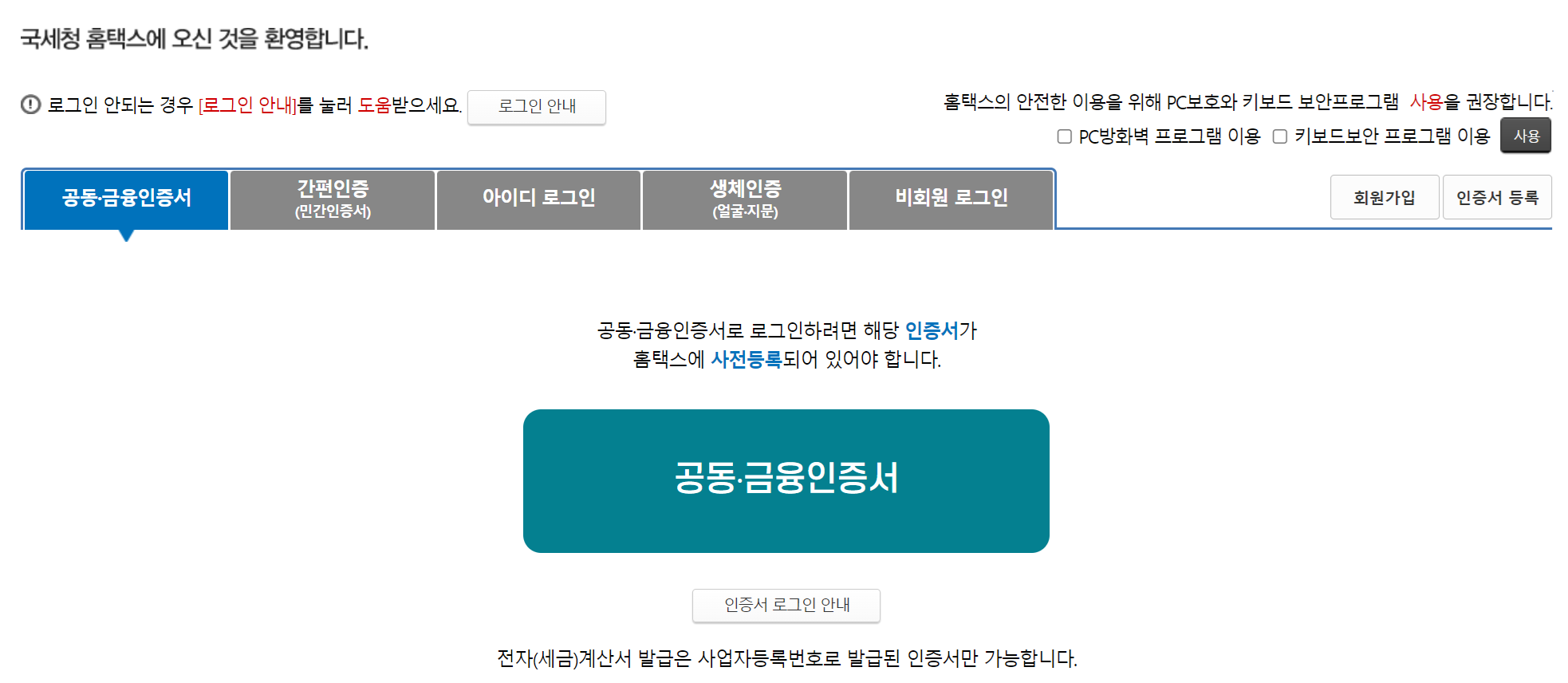 2. 좌측 상단에 있는 "전자(세금)계산서 현금영수증, 신용카드" 탭을 클릭합니다.