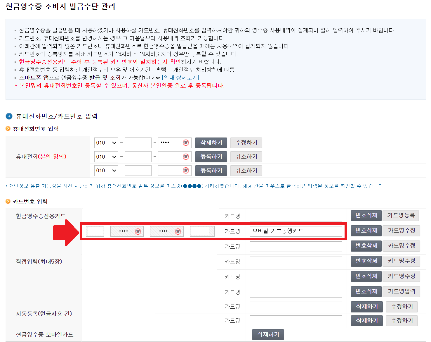 3. "현금영수증(근로자,소비자) → 소비자 발급수단 전용카드 → 현금영수증 발급용 휴대전화번호 및 카드과관리"를 클릭합니다.