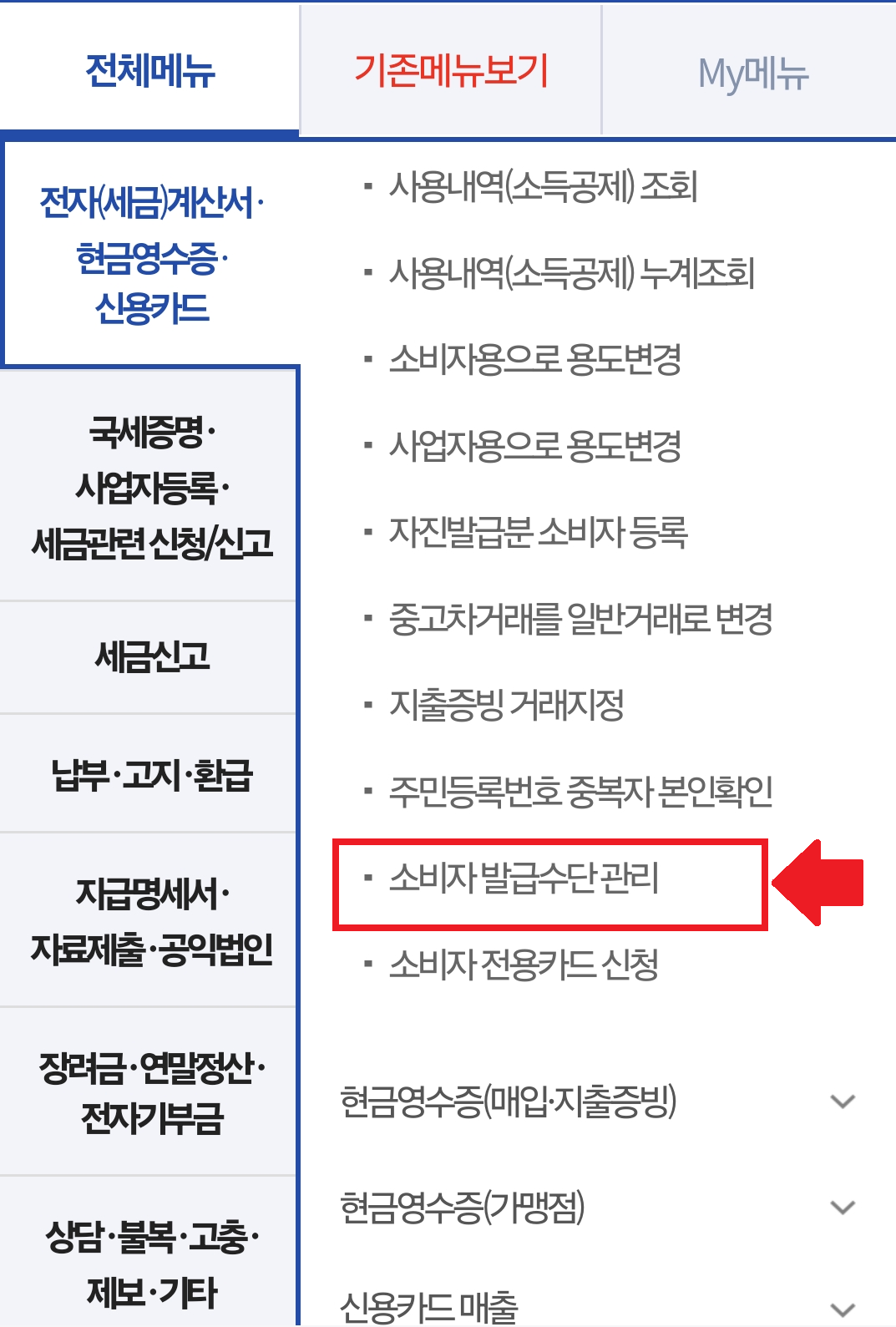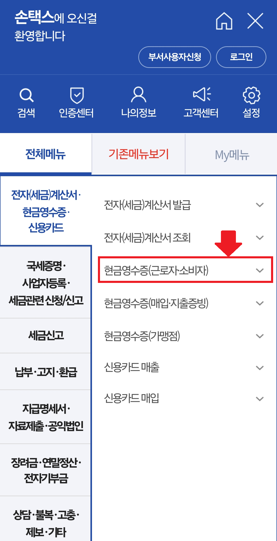 2. 오른쪽 상단에 "전체메뉴 → 현금영수증(근로자,소비자)"를 클릭합니다.