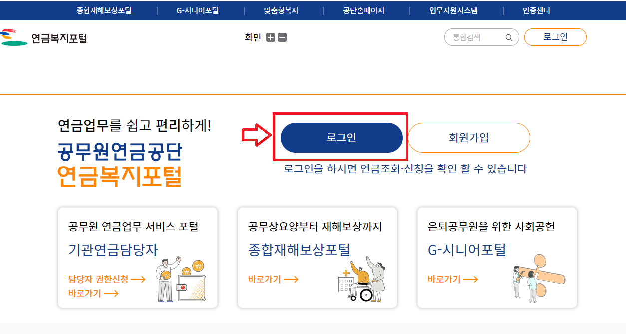 공무원연금공단 홈페이지→ 연금복지포털 바로가기→ 공무원연금공단 연금복지포털 사이트→ 로그인→ 공무원연금 조회