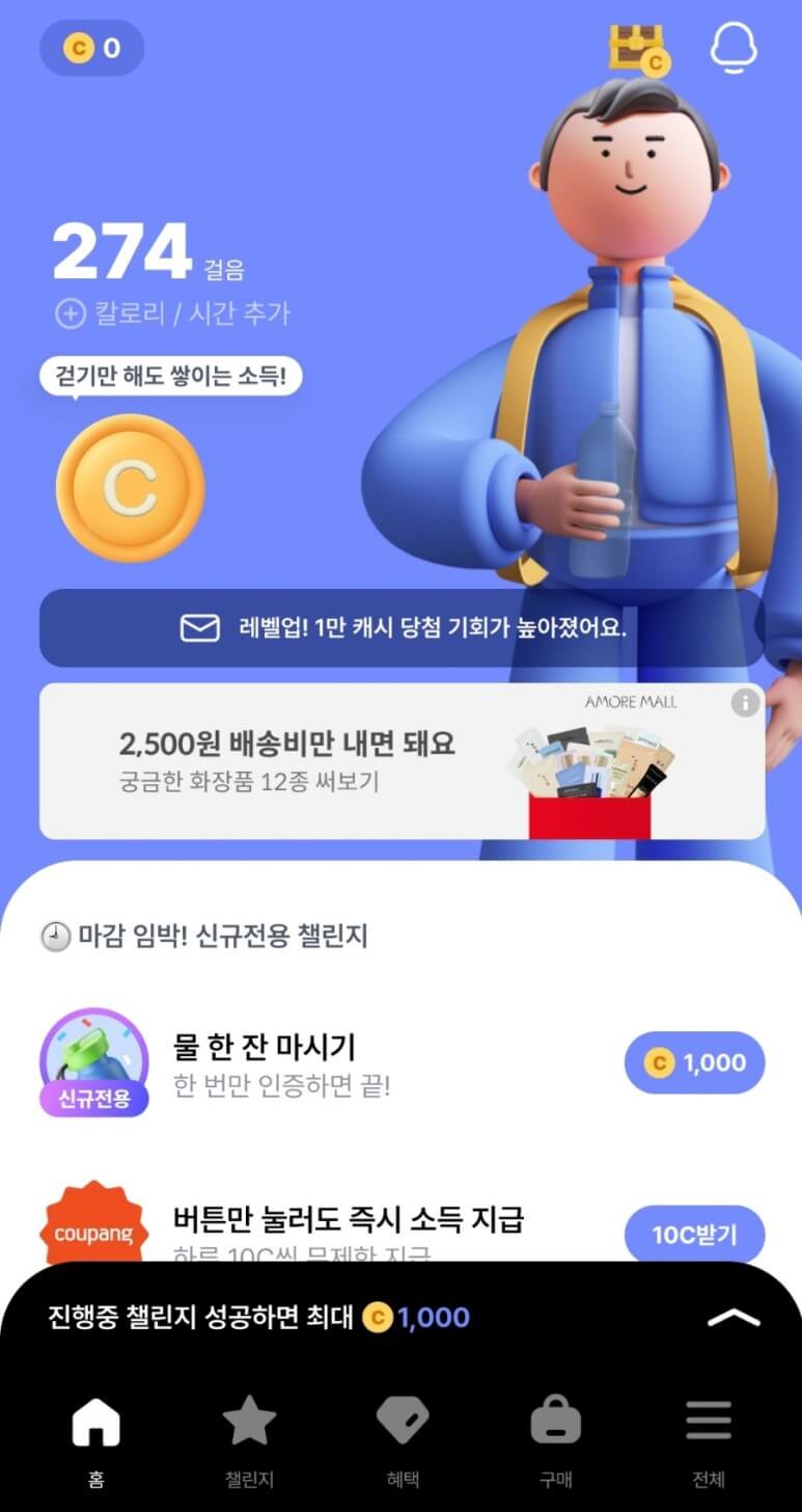 걸음수를 측정하여 코인을 획득할 수 있습니다. 1,000걸음당 3 코인을 얻을 수 있습니다.