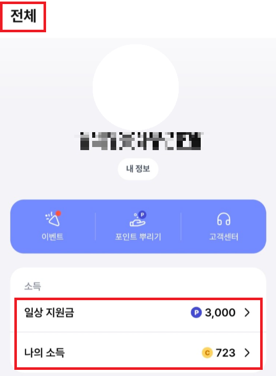 포인트(=일상지원금)와 코인(=소득)은 발로소득 앱 → 전체 탭에서 확인할 수 있습니다.