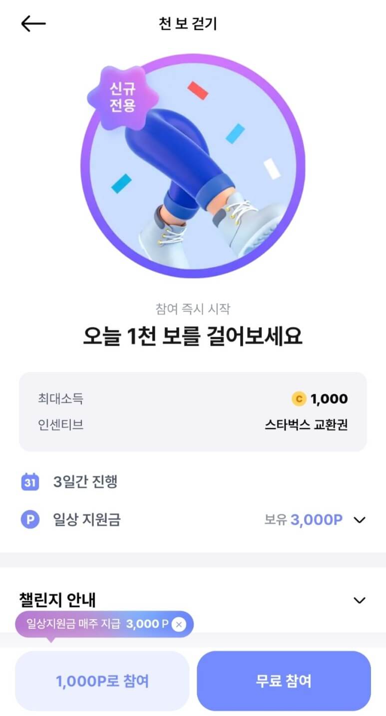 일상지원금이라고도 하며 챌린지 참여를 위하여 발로소득 앱에서 매주 3,000포인트를 자동으로 지급합니다. 포인트가 부족할 경우 친구에게 챌린지를 공유하면 무료로 참여할 수 있습니다.