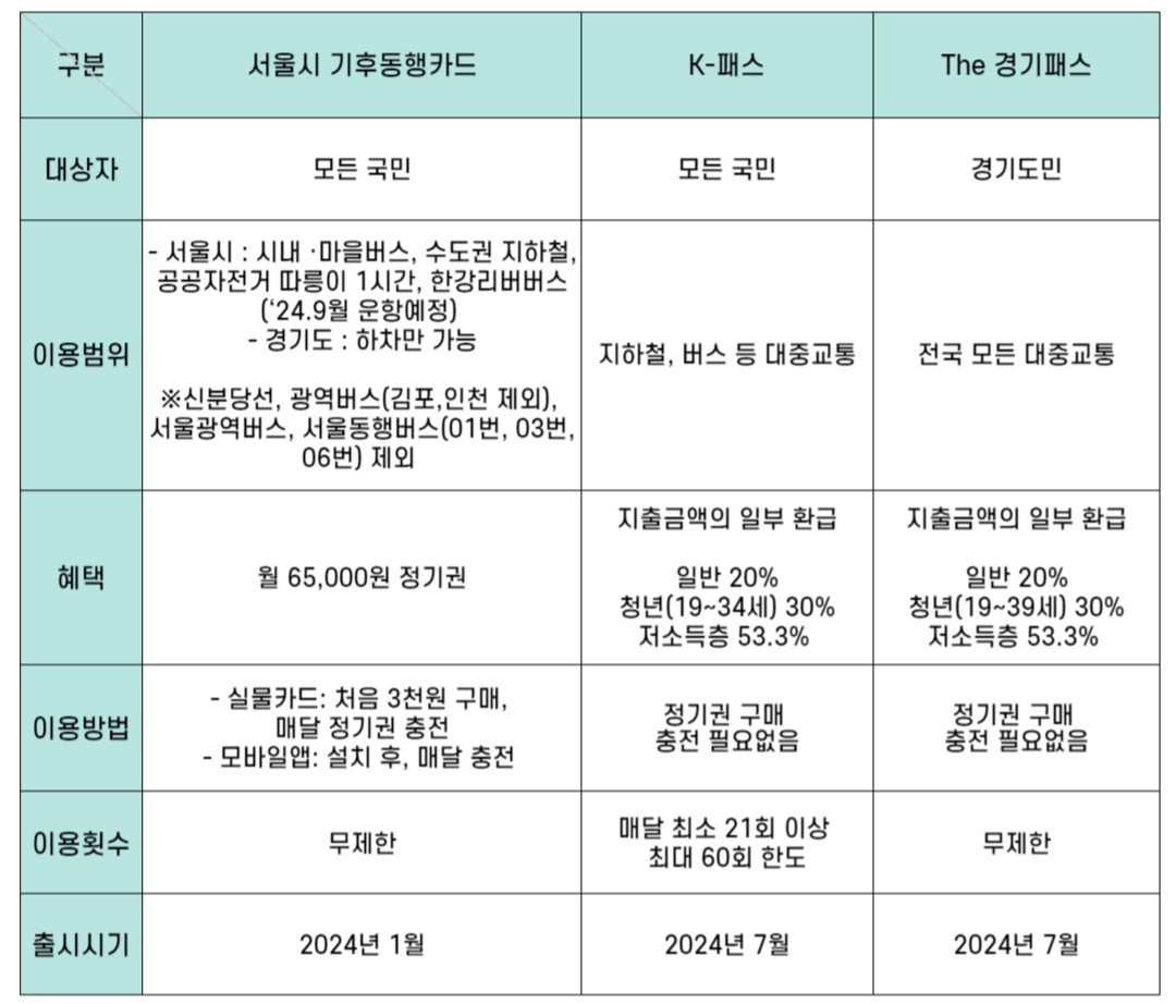 기후동행카드, K-패스, The 경기패스 핵심내용 및 비교