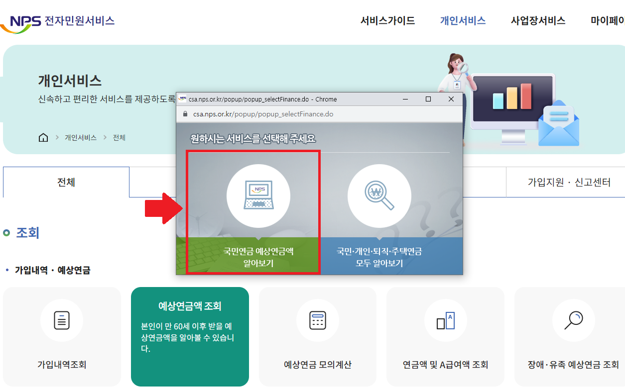 4. 팝업창에 뜨는 국민연금 예상수령액 알아보기 클릭