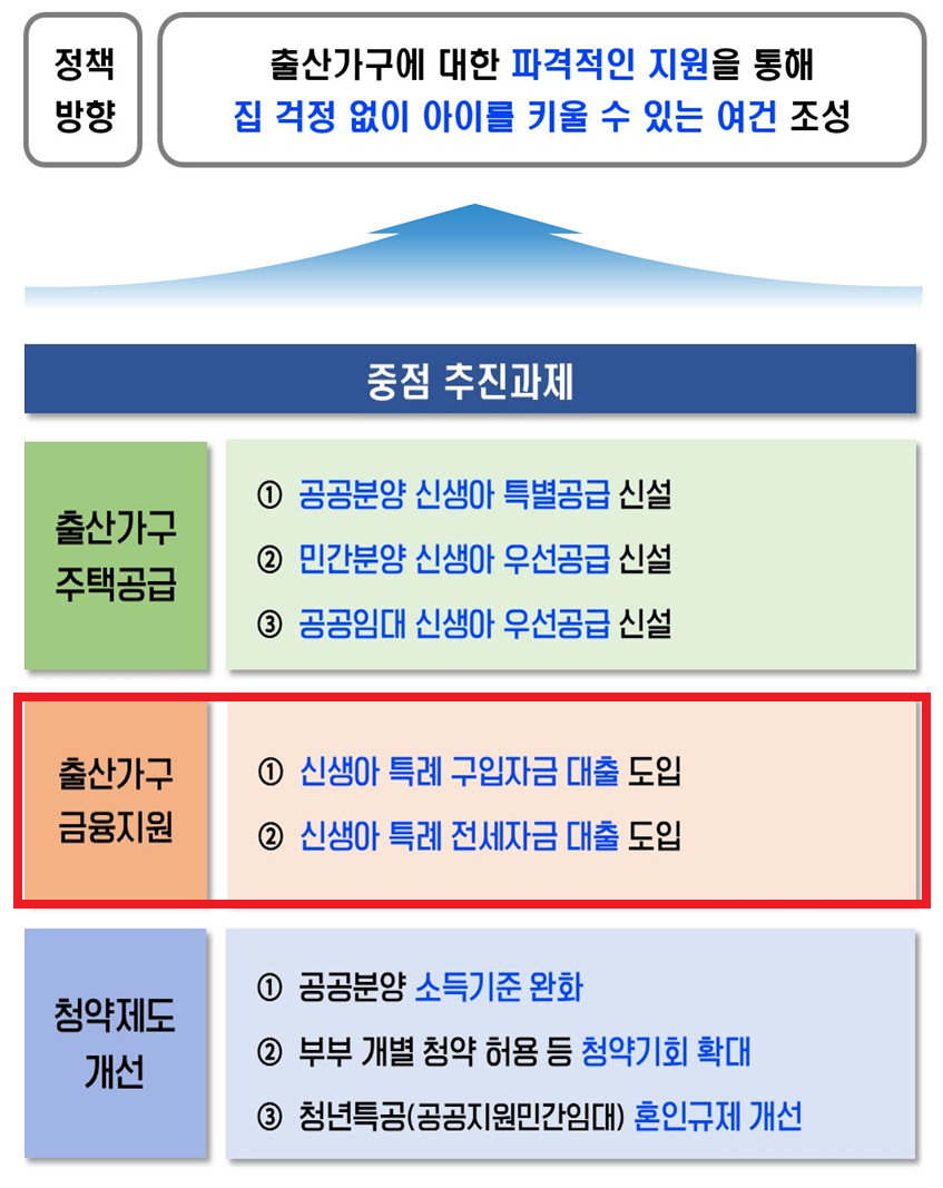 신생아를 출산한 가구의 내 집 마련 지원을 위해 저리로 주택구입자금을 대출해주는 제도입니다. 대출 대상을 기존에 대비하여 대폭 완화하여 폭넓게 지원할 수 있도록 하였습니다.