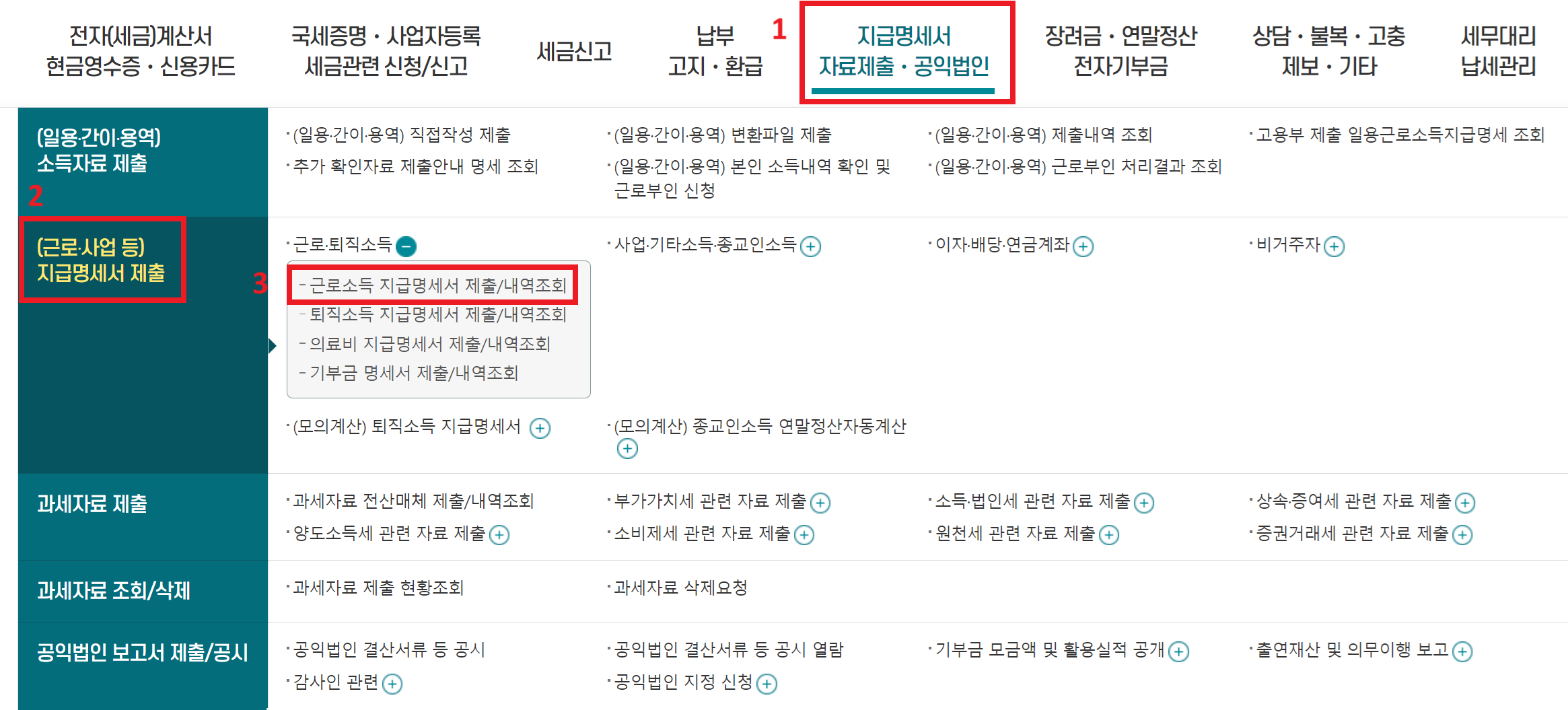 로그인 → 지급명세서, 자료제출, 공익법인 탭 → 지급명세서 제출→ 근로소득 지급명세서 제출/내역조회